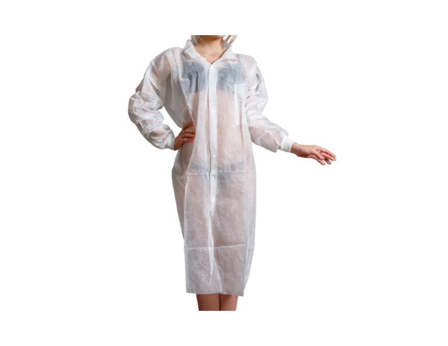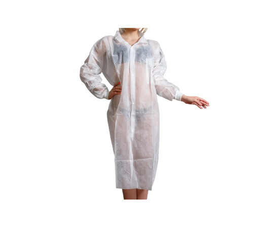 Одноразовый медицинский халат с трикотажным манжетом Polix PRO & MED(1 шт) из полипропилена с манжетами из полиэфира - одноразовый нестерильный халат, который подходит для применения в косметологии, парикмахерских, медицинских учреждениях для персонала и посетителей.