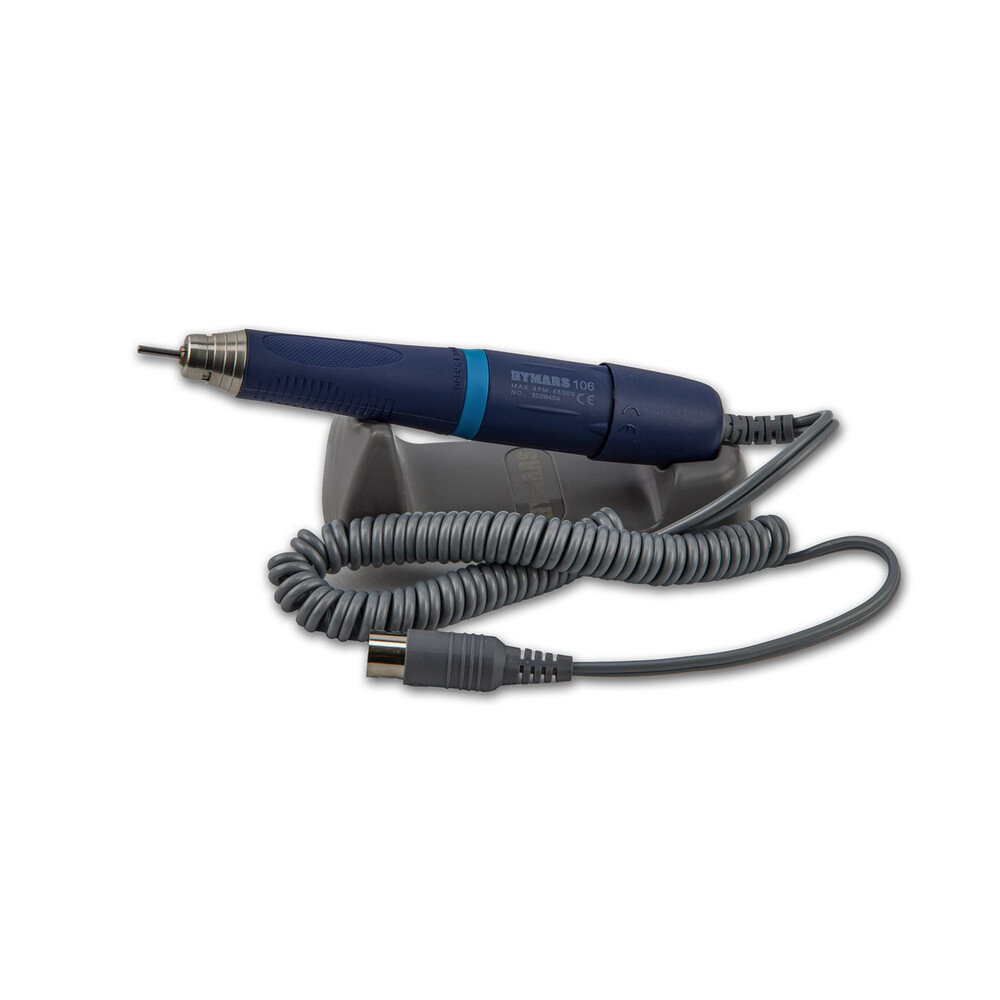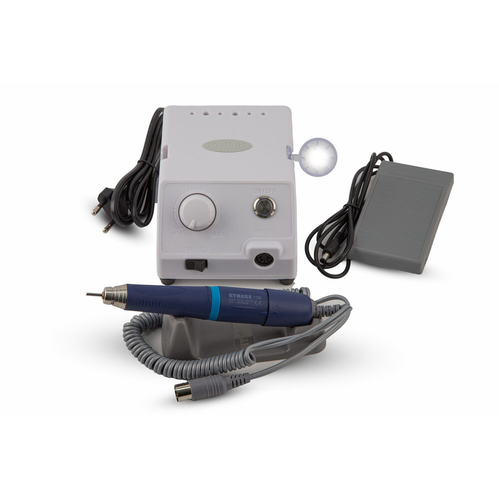 Фрезерный аппарат укомплектован ручкой HYMARS 106, максимальная рабочая скорость которой составляет 45000 об/мин, а крутящий момент - 5 Н·см. Ручка Hymars 106 – считается лучшей, мощной из всей линейки ручек-микромоторов с коллекторами.