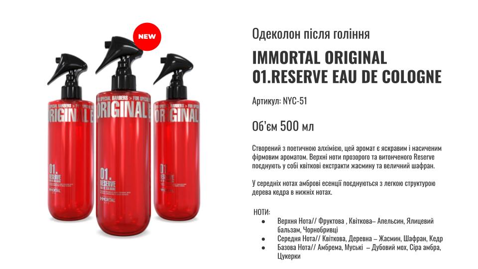 IMMORTAL 01 RESERVE ОДЕКОЛОН / КРАСНЫЙ. Разработанный с помощью поэтической алхимии, этот аромат является смелым и усиленным фирменным ароматом.