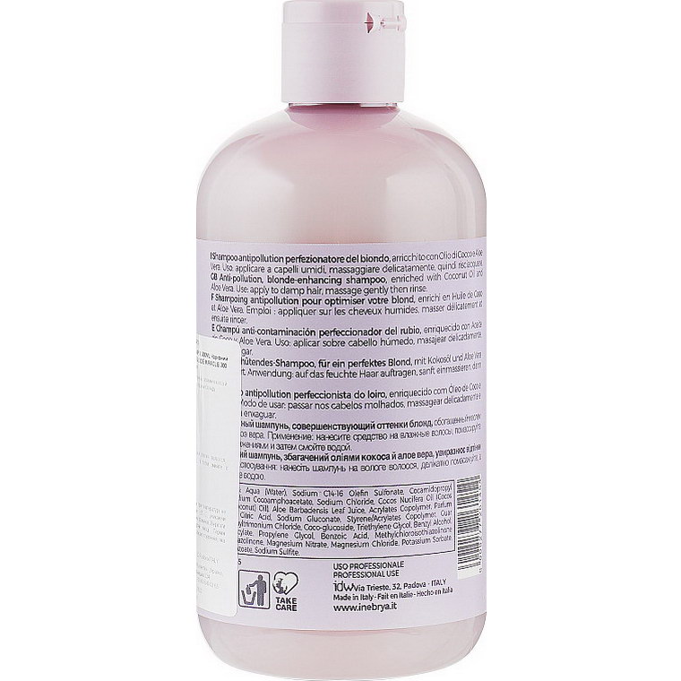 Balayage, airtouch, ombre или холодный пепельный однотон... Эти трендовые техники окрашивания требуют максимально бережного ухода. Мастера профессионального бренда Inebrya создали идеальный шампунь для блондинок. Его состав продуман до мелочей. Специальные компоненты нейтрализуют хлор и металлы водопроводной воды, которые могут вступать в негативную реакцию с крашеными волосами и мешать тщательной очистке. И это только одно из преимуществ средства!