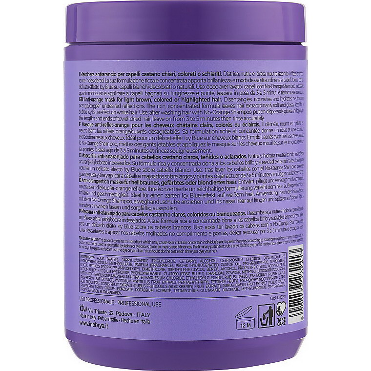 Оранжевый подтон довольно часто появляется после окрашивания и осветления каштановых волос. Чтобы устранить нежелательный оттенок, придать локонам мягкость и блеск, эксперты бренда Inebrya создали специальную маску – Blondesse No-Orange Mask. Профессиональный бьюти-продукт обладает глубоким питательным и увлажняющим действием благодаря высокой концентрации экстрактов ягод малины, черники и ежевики. Средство эффективно устраняет оранжевый цвет, дарит локонам роскошное сияние и шелковистость.