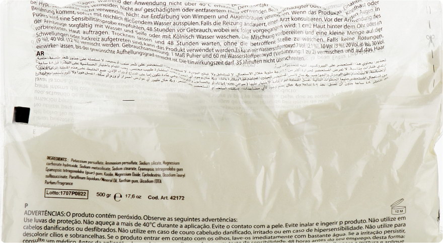 Potassium persulfate, Ammonium persulfate, Sodium silicate, Magnesium carbonate hydroxide, Sodium metasilicate, Sodium stearate, Cyamopsis tetragonoloba gum, Kaolin, Magnesium Oxide, Cyclodextrin, Disodium lauryl sulfosuccinate, Paraminum EDTA, Parfum/Fragrance