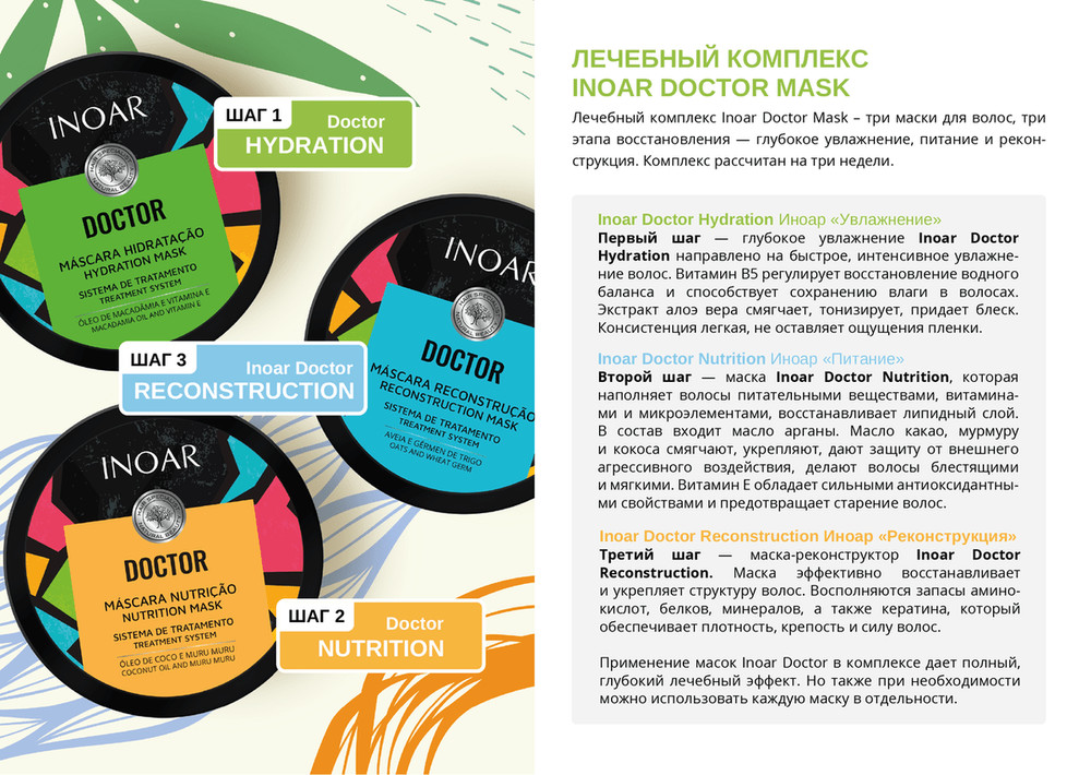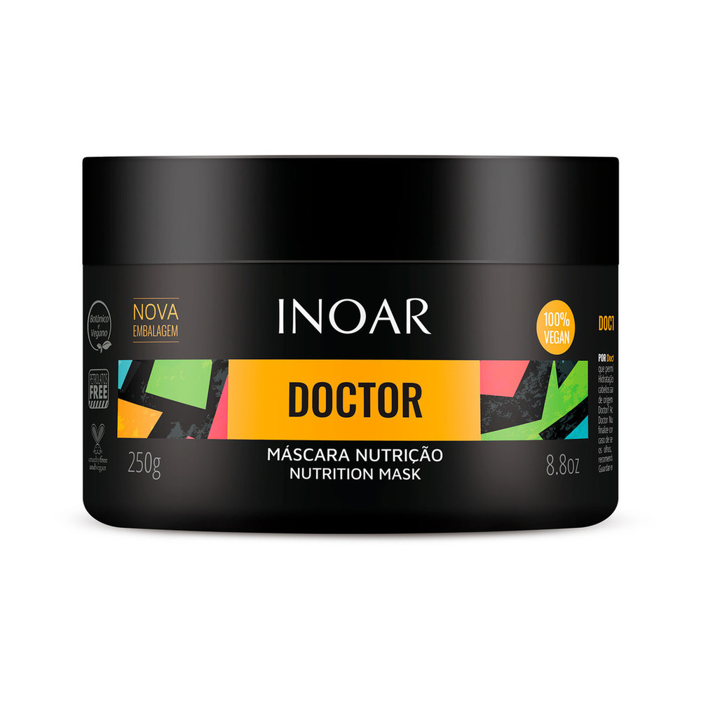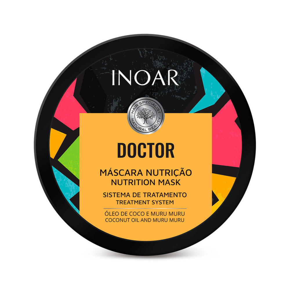 Иноар разработала лечебный комплекс Inoar Doctor Mask в который входит набор из трех масок, применяемых по очереди в течение трех недель. Маска Inoar Doctor Nutrition Mask - это второй этап лечебного комплекса который питает волосы. Маска восстанавливает поврежденный липидный слой. Волосы становятся шелковистыми, мягкими, появляется здоровый блеск. Кокосовое масло, масло какао и мурумуру укрепляют, увлажняют, придают блеск и эластичность. Витамины Е предотвращает старение волос. В комплексе маску используют с третьего мытья головы, чередуя с маской Inoar Doctor Hydration.