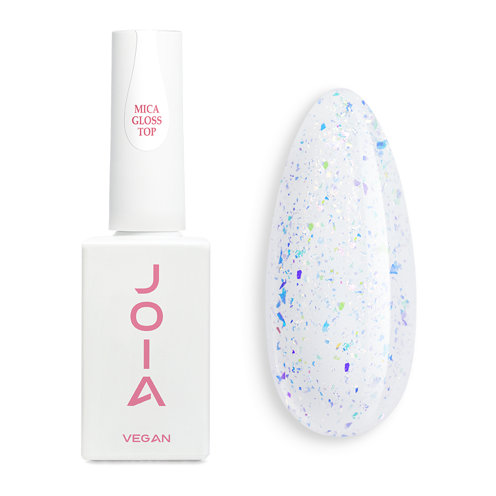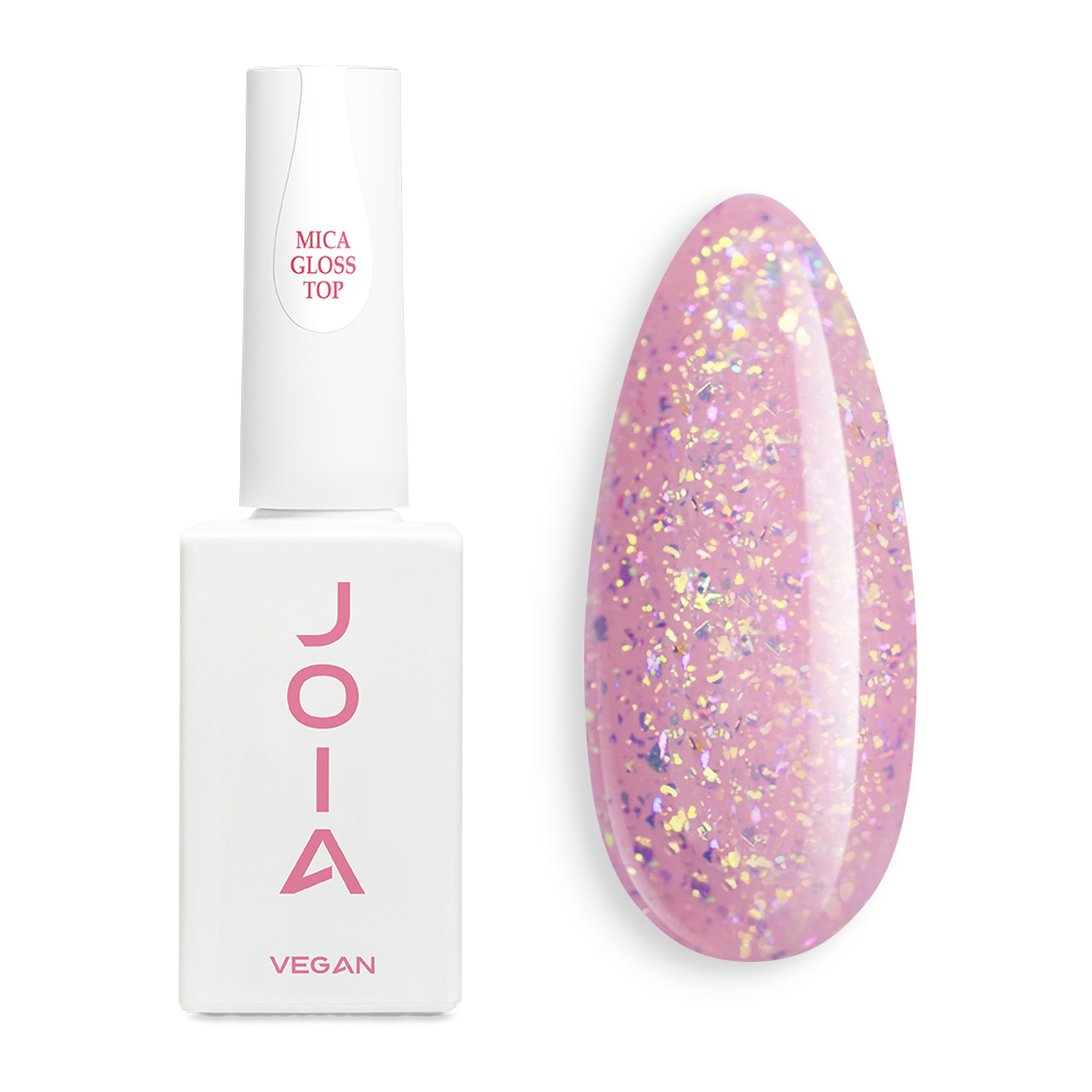 UV/LED Mica Gloss Top JOIA vegan 1 это глянцевый финиш без липкого слоя с россыпью частиц мелкой декоративной слюды. Несколько движений кисточкой и изысканное покрытие готово!