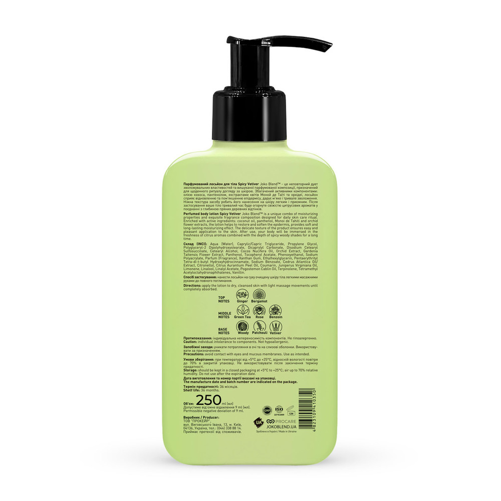 Парфюмированный лосьон для тела Spicy Vetiver Joko Blend™ - это неповторимый дуэт увлажняющих свойств и изысканной парфюмерной композиции, предназначенный для ежедневного ритуала ухода за кожей.