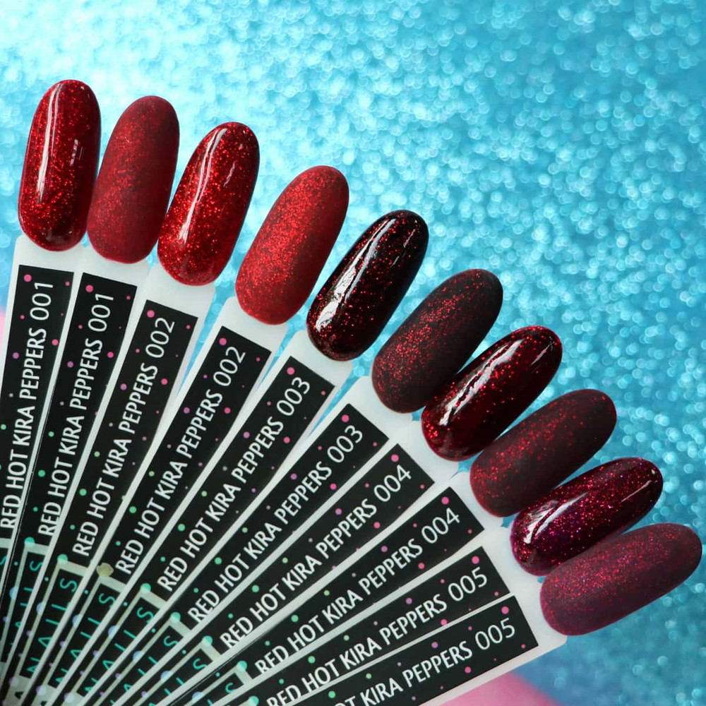 Пять оттенков красного цвета с плотными блестками равномерно распределяются по ногтевой пластине и украсят ее до торжественных мер или дополнят ваш элегантный вид. Гель-лаки не обладают неприятным запахом, долго держат блеск и цвет.