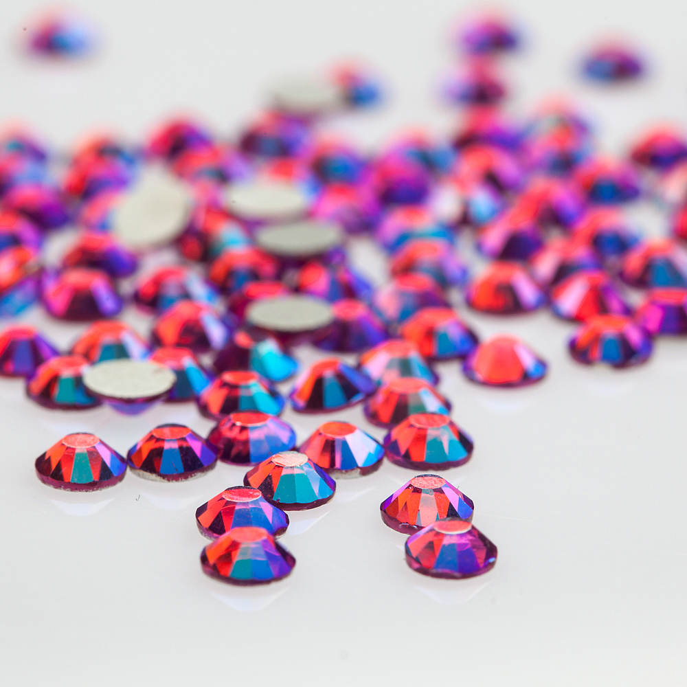Кристаллы в оттенке «Fucsia AB» благодаря яркому и выраженному оттенку хорошо подходят для акцентирования отдельных ногтей и создания узоров. Они изготовлены из специального стекла, имеют фольгированную основу и алмазную огранку, что придает им превосходные светоотражающие свойства. Способ крепления зависит от используемых при покрытии материалов.