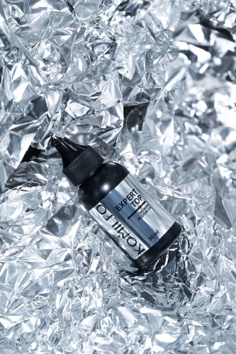 - Нанесите верхнее покрытие Komilfo для гель-лака тонким слоем и просушите его в LED-лампе 90 секунд. В УФ-лампе – ​​максимальное количество времени, указанное на таймере.
