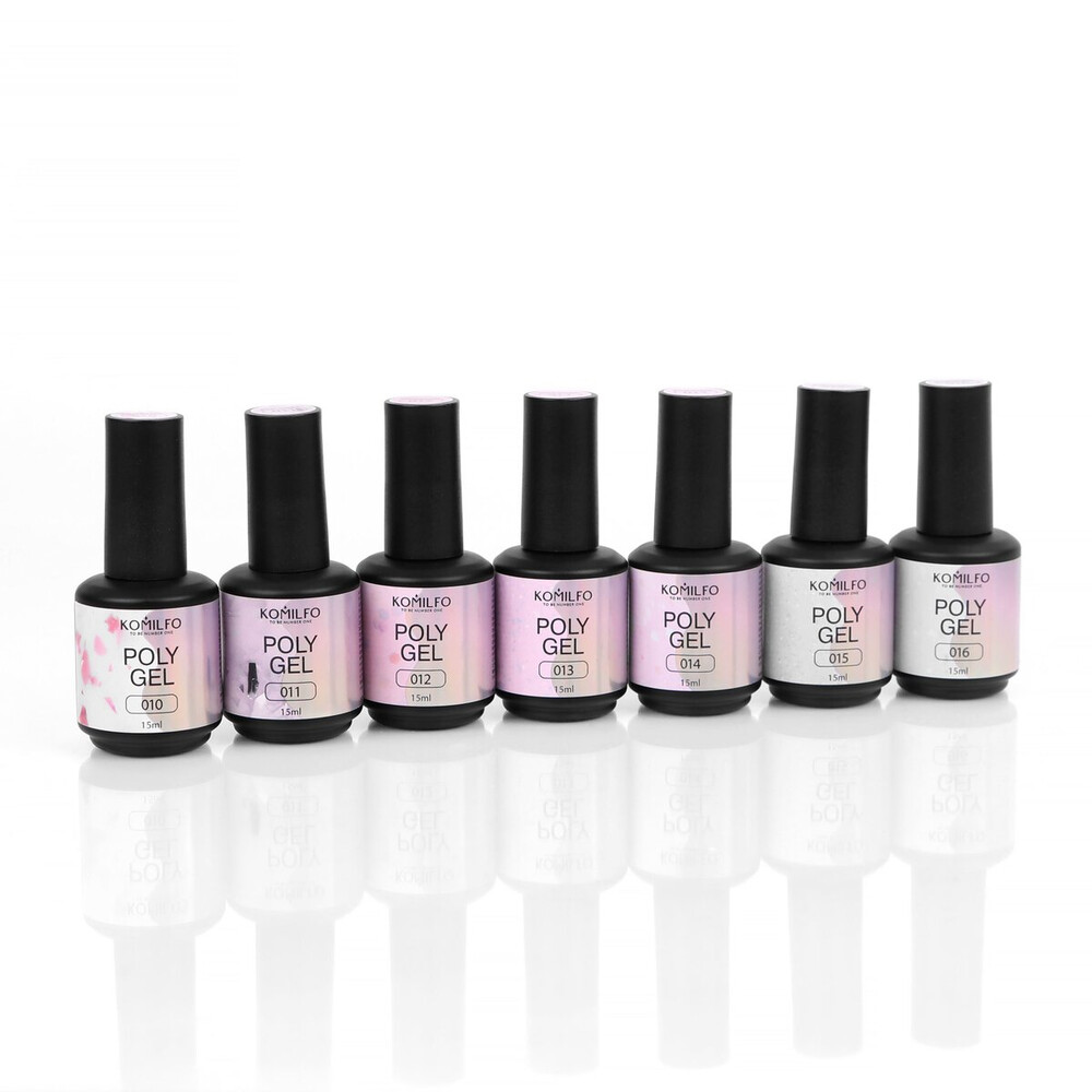 Komilfo PolyGel – это новый материал, который по своим характеристикам напоминает всеми любимый Bottle Gel, но имеет более редкую консистенцию, не жжет в лампе, самовыравнивается и очень легкий и быстрый в работе.