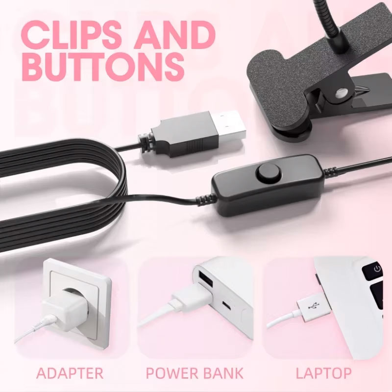 Благодаря надежной клипсе лампу легко закрепить на столе или другой поверхности, а встроенный переключатель на кабеле обеспечивает удобное управление питанием.