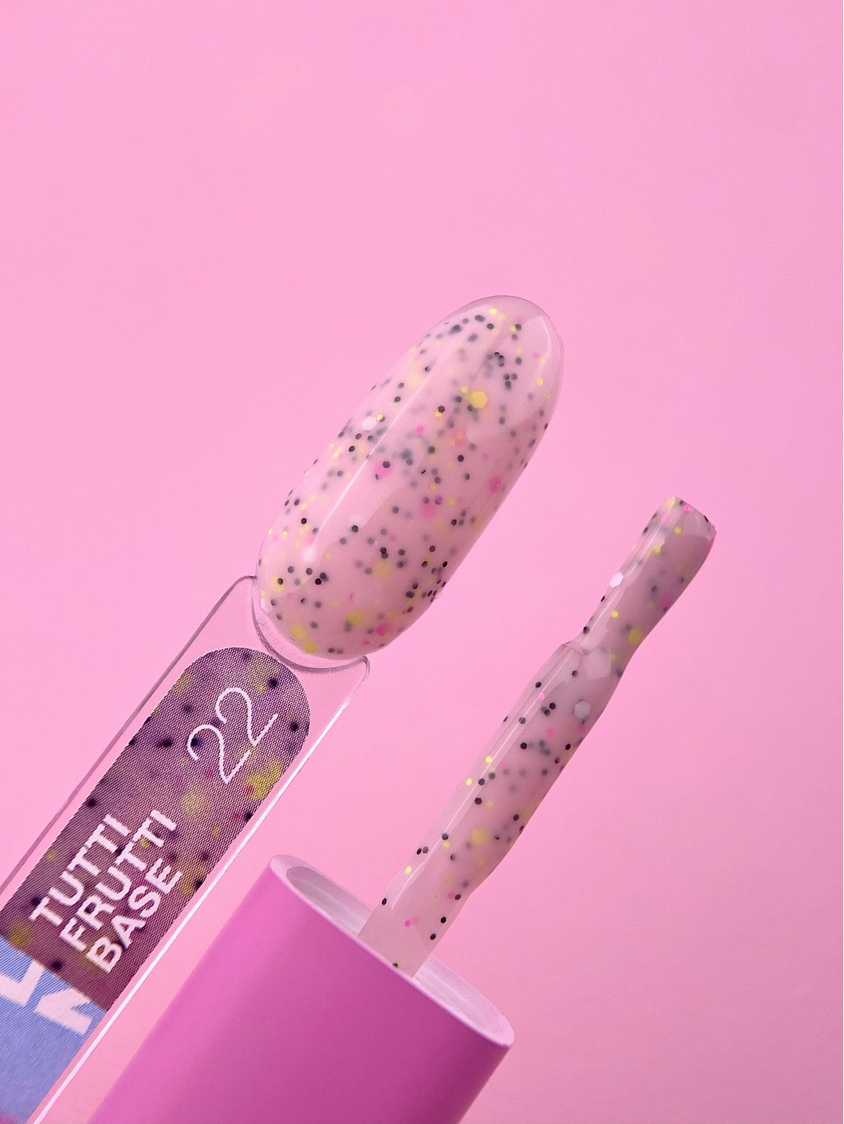 Tutti Frutti Base 22 — это камуфлирующая база с цветными фигурками для покрытия и выравнивания ногтей.