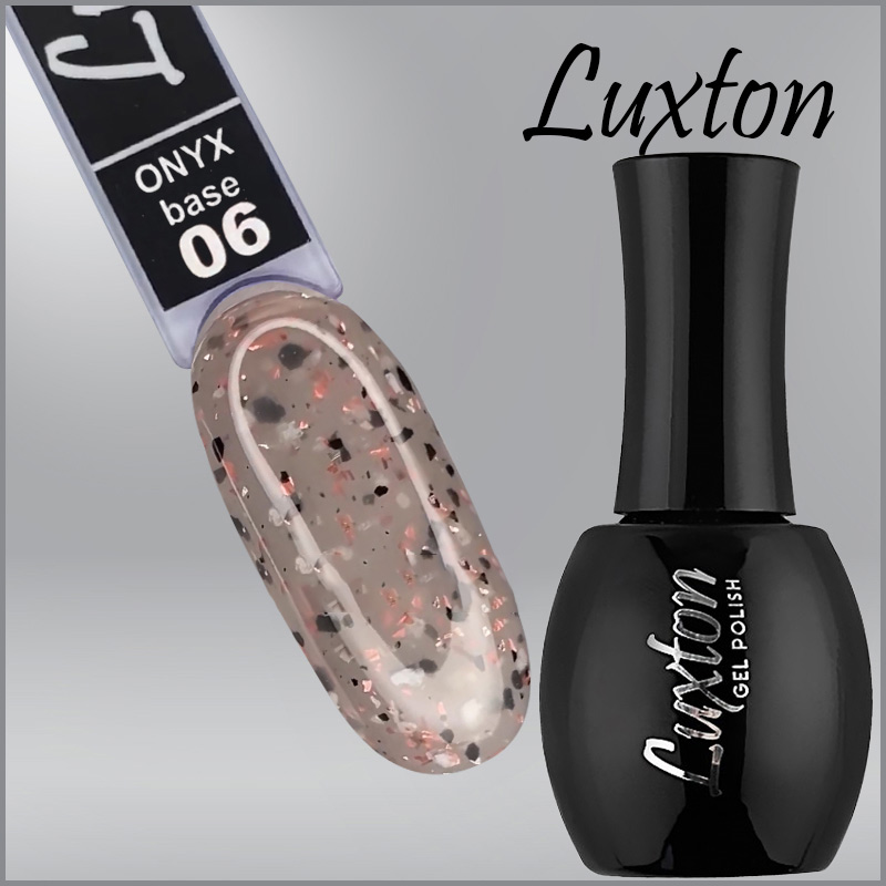 Купить Камуфлирующая база LUXTON Onyx Base №006 серая беж с чорно-белыми хлопьями и персиковой поталью, 15 мл,, вы сможете в нашем интернет магазине limonad с доставкой по всей Украине в том числе и Киев, Днепр, Одесса, Харьков, Запорожье, Одесса, Львов и многие другие населенные пункты.