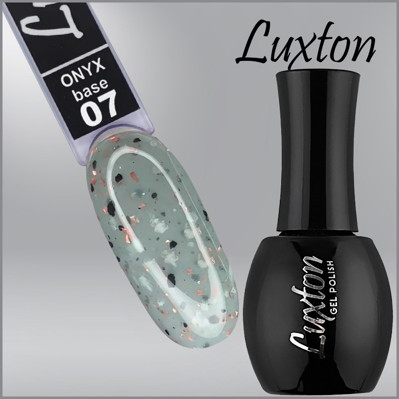 Купить Камуфлирующая база LUXTON Onyx Base №007 светлая серая с черными хлопьями и персиковой поталью, 15 мл,, вы сможете в нашем интернет магазине limonad с доставкой по всей Украине в том числе и Киев, Днепр, Одесса, Харьков, Запорожье, Одесса, Львов и многие другие населенные пункты.