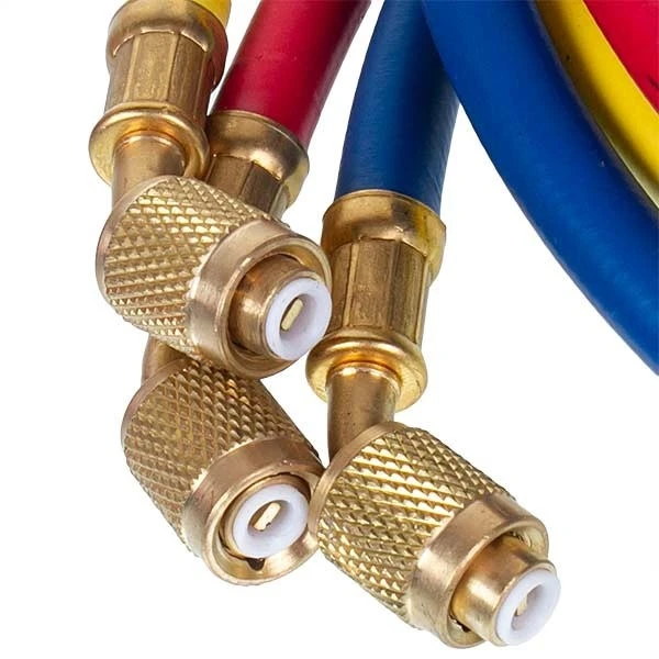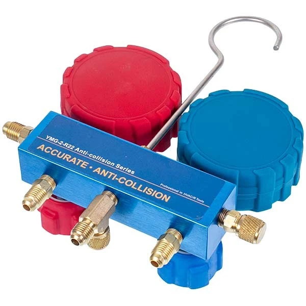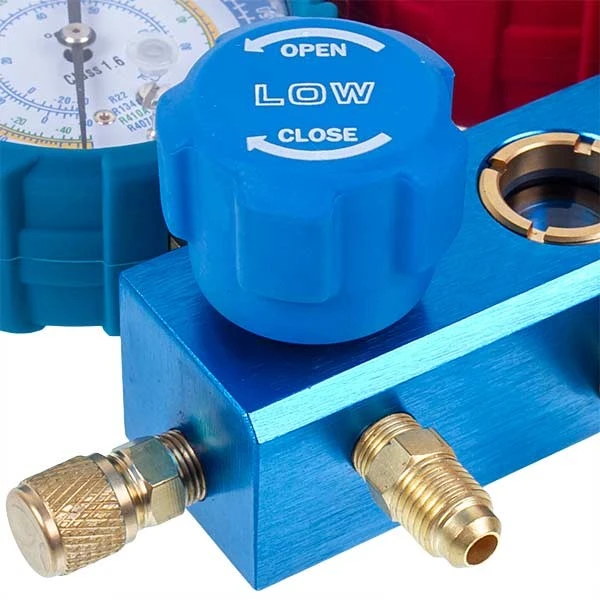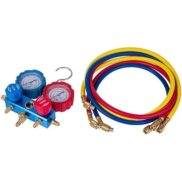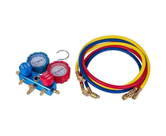 При подключении манометрической станции к холодильному агрегату и заправочному баллону с холодагентом или к холодильному агрегату и вакуумному насосу используются специальные шланги. Клапан на коллекторе регулирует поток холодагента между шлангами разных цветов. Цветные манометры (синие и красные) используются для измерения давления с разных сторон - всасывания и нагнетания.