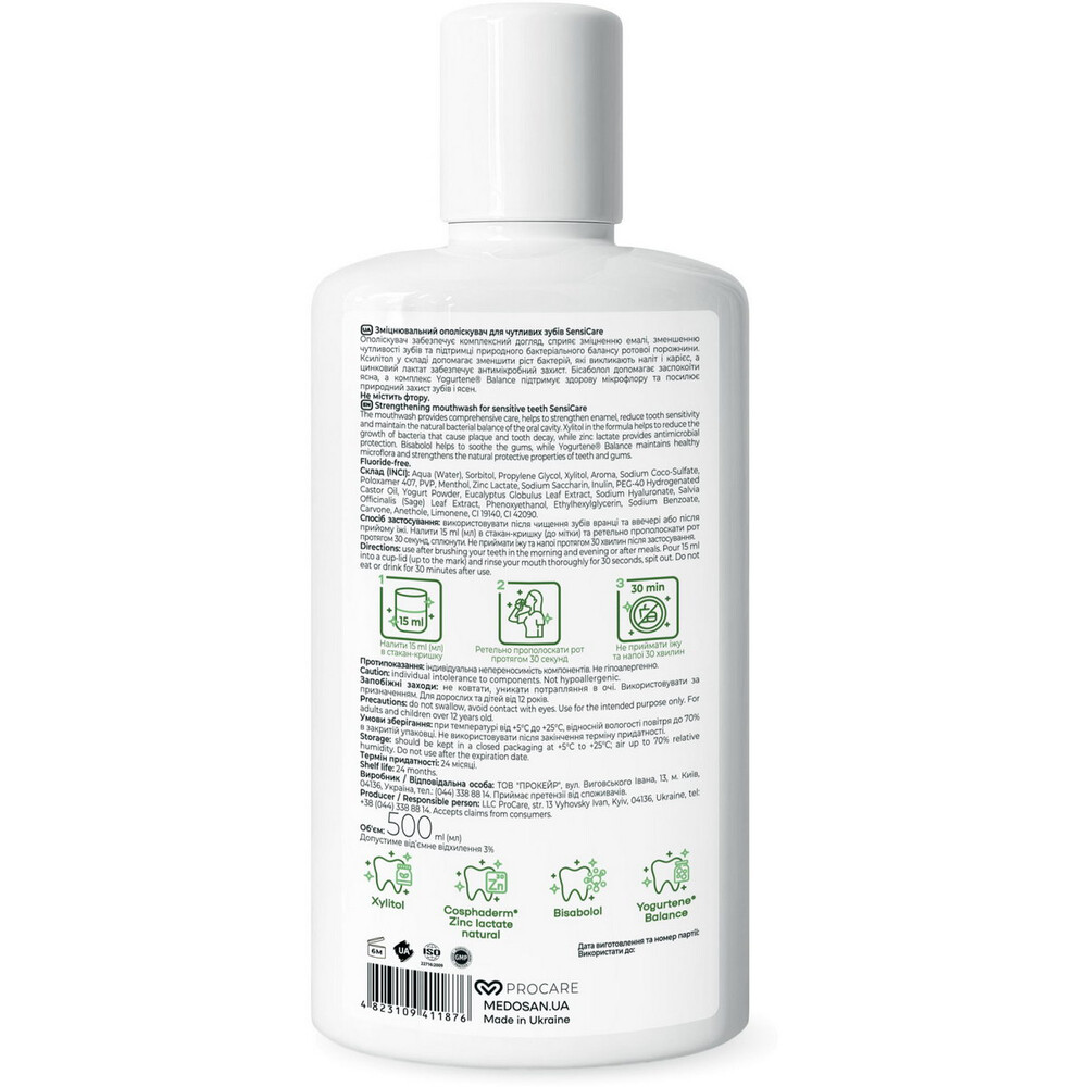 Ополаскиватель Medosan® SensiCare обеспечивает комплексный уход, способствует укреплению эмали, уменьшению чувствительности зубов и поддержанию естественного бактериального баланса полости рта . Ксилитол в составе помогает снизить рост бактерий, вызывающих налет и кариес, а цинковый лактат обеспечивает антимикробную защиту. Бисаболол помогает успокоить десну, а комплекс Yogurtene ® Balance поддерживает здоровую микрофлору и усиливает естественную защиту зубов и десен.