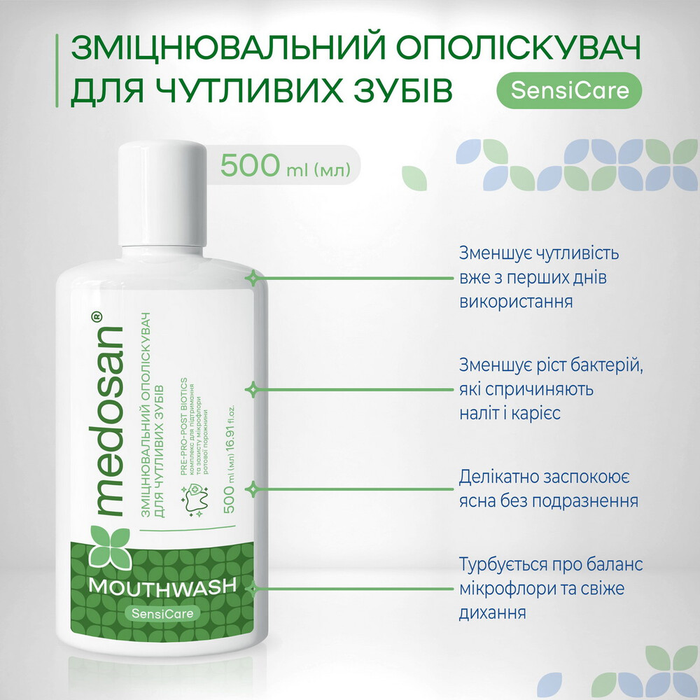 Укрепляющий ополаскиватель для чувствительных зубов Medosan ® SensiCare – это ежедневная поддержка для чувствительных зубов и десен в формате ополаскивателя.