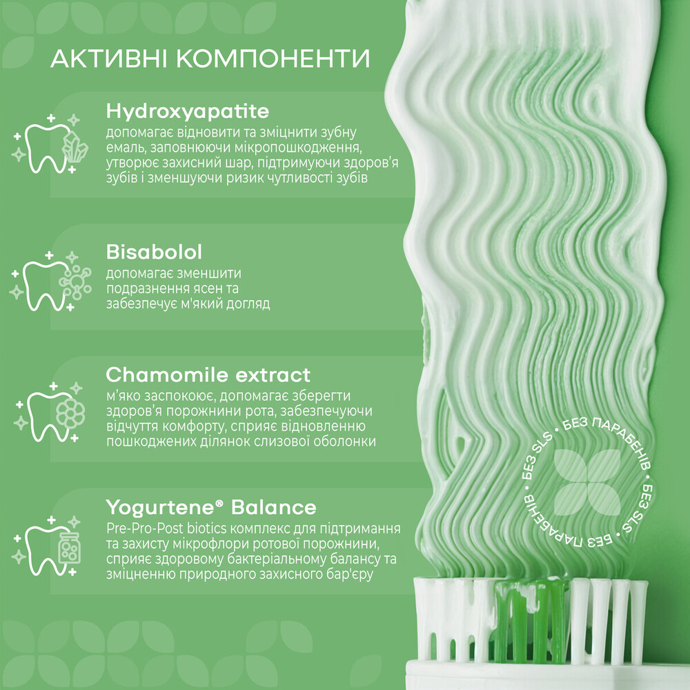 Aqua (Water), Sorbitol, Hydrated Silica, Sodium Coco-Sulfate, PEG-32, Hydroxyethylсellulose, Aroma, Menthol, Inulin, Yogurt Powder, Chamomilla Recutita (Matricaria) Flower Extract, Bisabolol, Titanium Dioxide Saccharin, Xanthan Gum, Sodium Fluoride, PVP, Phenoxyethanol, Ethylhexylglycerin, Sodium Benzoate, Carvone, Anethole.