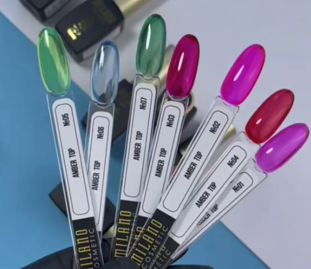 TOP AMBER MILANO — декоративное топовое покрытие с теплым янтарным оттенком, которое придает маникюру глубины, мягкости и благородного сияния. Топ создает эффект теплого фильтра, красиво меняя базовый цвет и придавая покрытию премиального характера.