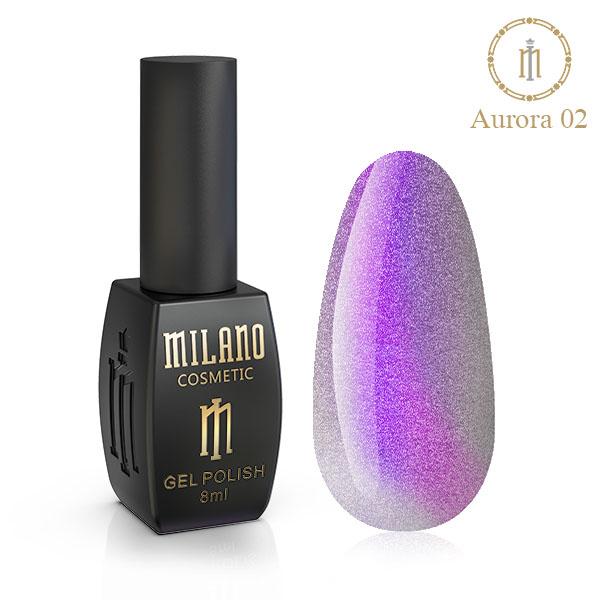 Гель лак Aurora Milano 8 мл относится к блестящей коллекции качественных гель-лаков Cat Eye TM Milano Cosmetic. Название данного гель-лака для ногтей ассоциируется с полярным камнем, который напоминает глаз кота с вертикальным зрачком.