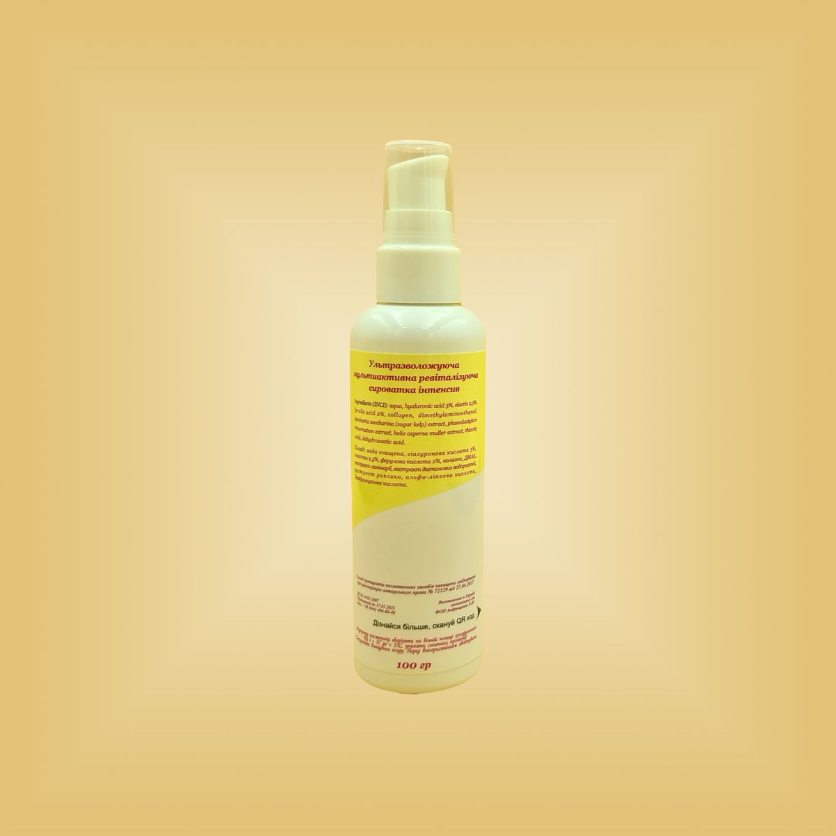 Состав: гиалуроновая кислота 3%, эластин 2,5%, феруловая кислота 2%, коллаген, ДМАЭ, экстракт ламинарии, экстракт диатомовых водорослей, экстракт улитки, альфа-липоевая кислота, дегидроуксусная кислота.