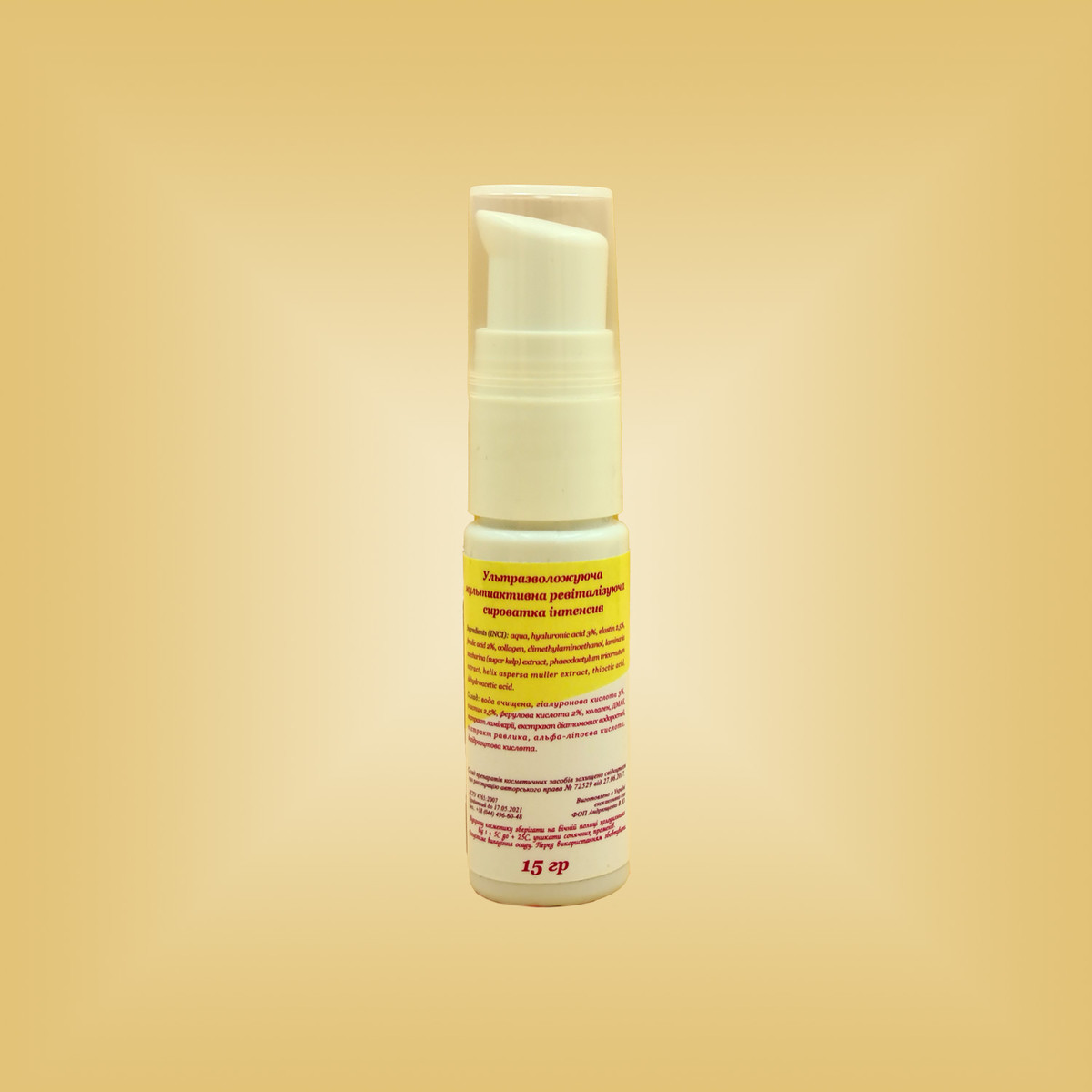 Состав: гиалуроновая кислота 3%, эластин 2,5%, феруловая кислота 2%, коллаген, ДМАЭ, экстракт ламинарии, экстракт диатомовых водорослей, экстракт улитки, альфа-липоевая кислота, дегидроуксусная кислота.