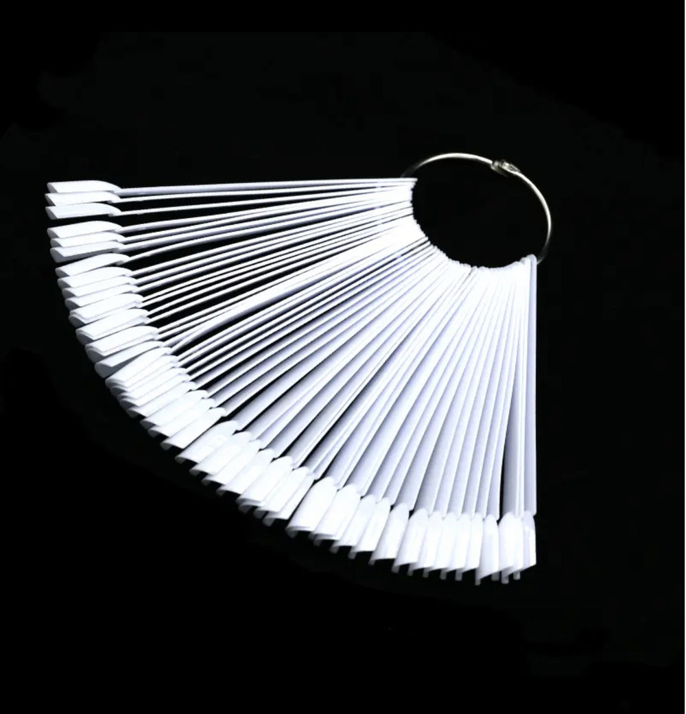 В наборе веера - палитры идет 50 типс, которые скреплены при помощи металлического кольца, что позволяет держать все типсы в одном месте, но при этом их удобно показывать клиенту.