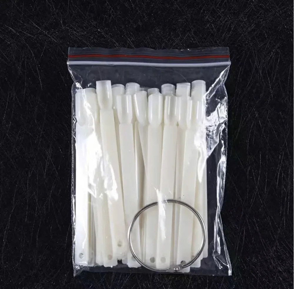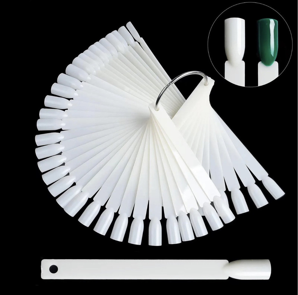 В наборе веера - палитры идет 50 типс, которые скреплены при помощи металлического кольца, что позволяет держать все типсы в одном месте, но при этом их удобно показывать клиенту.