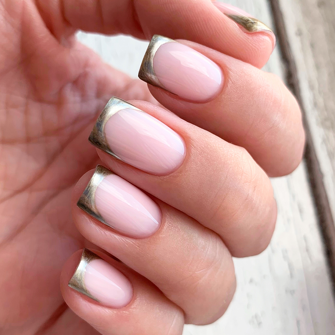 - Нанесите Fusion Gel Paint PNB, Gold тонким слоем и подождите 30-60 секунд перед полимеризацией, чтобы пигмент осел.