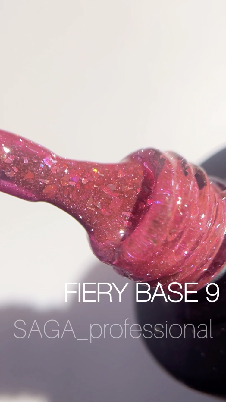 Saga Fiery Base №09 (малиновый светоотражающий) 8 мл – камуфлирующая база для гель-лака из новой линейки светоотражающих баз от бренда Saga. Легкий шиммер при солнечном свете сменяется неудержимым бриллиантовым сиянием при попадании под искусственное освещение. Покрытие можно использовать и в качестве базы, и как цветной гель-лак на подложку. База плотно пигментированная, дает хороший блеск даже при нанесении в один слой, не кислотная, при полимеризации не печет.