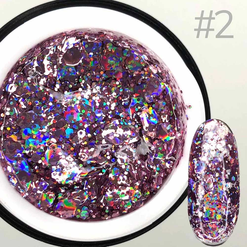 Гель Galaxy Glitter от производителя Saga Professional это инновационный дизайн-гель для ногтей, в состав которого входит разноцветный глиттер, брокат и фольгированные элементы разных размеров и форм. Glitter gel применяется в качестве декоративного покрытия. Гель имеет плотную консистенцию, легко наносить и равномерно распределять по ногтевой пластине. Гель для ногтей Saga идеально подходят для праздничного образа, чтобы создать яркий, блестящий, мерцающий маникюр. Гель с глиттером можно использовать самостоятельно, на цветной гель-лаковой подложке, для дизайна с растяжкой, а также при моделировании выкладного френча. Наносить можно как на натуральные ногти, так и на искусственные.