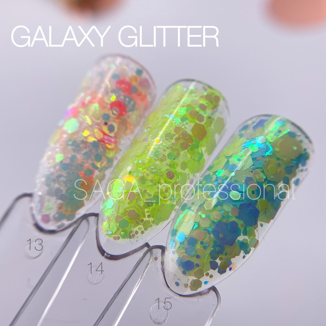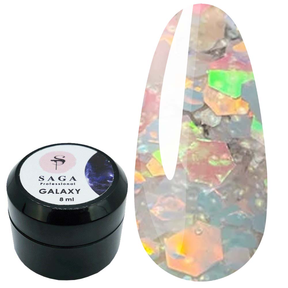 Гель Galaxy Glitter от производителя Saga Professional это инновационный дизайн-гель для ногтей, в состав которого входит разноцветный глиттер, брокат и фольгированные элементы разных размеров и форм. Glitter gel применяется в качестве декоративного покрытия. Гель имеет плотную консистенцию, легко наносить и равномерно распределять по ногтевой пластине. Гель для ногтей Saga идеально подходят для праздничного образа, чтобы создать яркий, блестящий, мерцающий маникюр. Гель с глиттером можно использовать самостоятельно, на цветной гель-лаковой подложке, для дизайна с растяжкой, а также при моделировании выкладного френча. Наносить можно как на натуральные ногти, так и на искусственные.