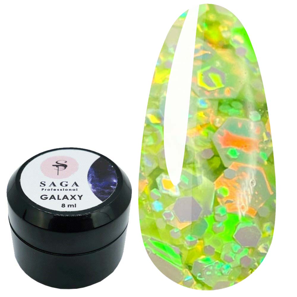 Гель Galaxy Glitter от производителя Saga Professional это инновационный дизайн-гель для ногтей, в состав которого входит разноцветный глиттер, брокат и фольгированные элементы разных размеров и форм. Glitter gel применяется в качестве декоративного покрытия. Гель имеет плотную консистенцию, легко наносить и равномерно распределять по ногтевой пластине. Гель для ногтей Saga идеально подходят для праздничного образа, чтобы создать яркий, блестящий, мерцающий маникюр. Гель с глиттером можно использовать самостоятельно, на цветной гель-лаковой подложке, для дизайна с растяжкой, а также при моделировании выкладного френча. Наносить можно как на натуральные ногти, так и на искусственные.