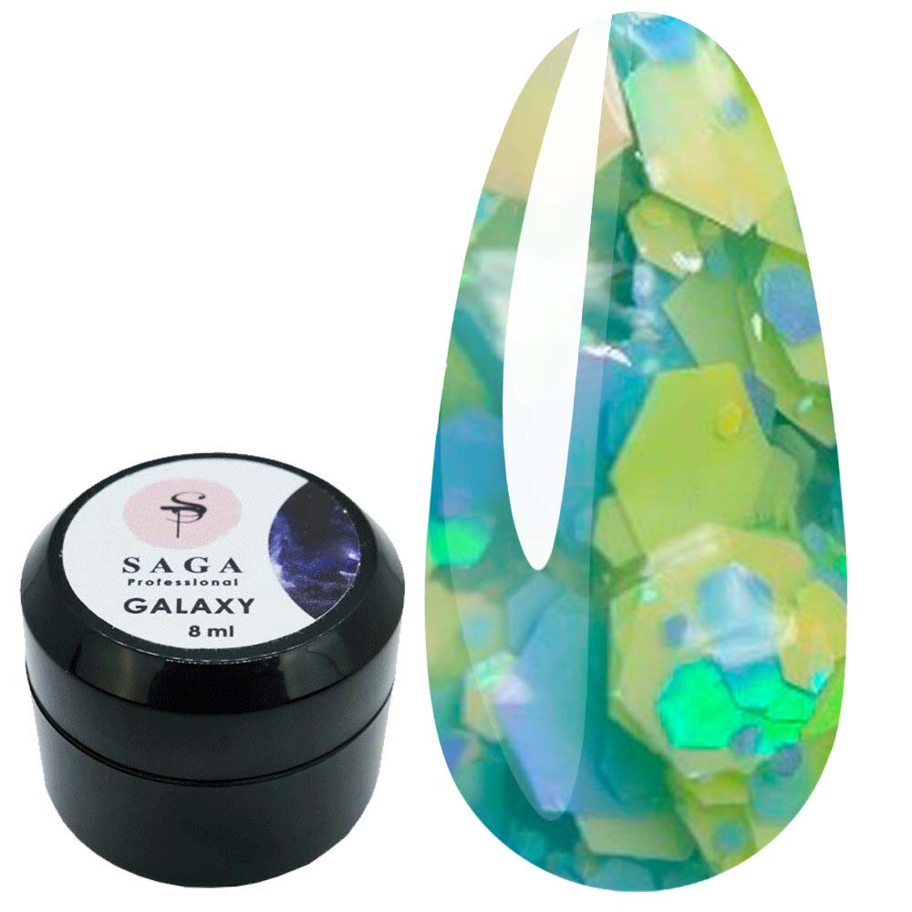 Гель Galaxy Glitter от производителя Saga Professional это инновационный дизайн-гель для ногтей, в состав которого входит разноцветный глиттер, брокат и фольгированные элементы разных размеров и форм. Glitter gel применяется в качестве декоративного покрытия. Гель имеет плотную консистенцию, легко наносить и равномерно распределять по ногтевой пластине. Гель для ногтей Saga идеально подходят для праздничного образа, чтобы создать яркий, блестящий, мерцающий маникюр. Гель с глиттером можно использовать самостоятельно, на цветной гель-лаковой подложке, для дизайна с растяжкой, а также при моделировании выкладного френча. Наносить можно как на натуральные ногти, так и на искусственные.
