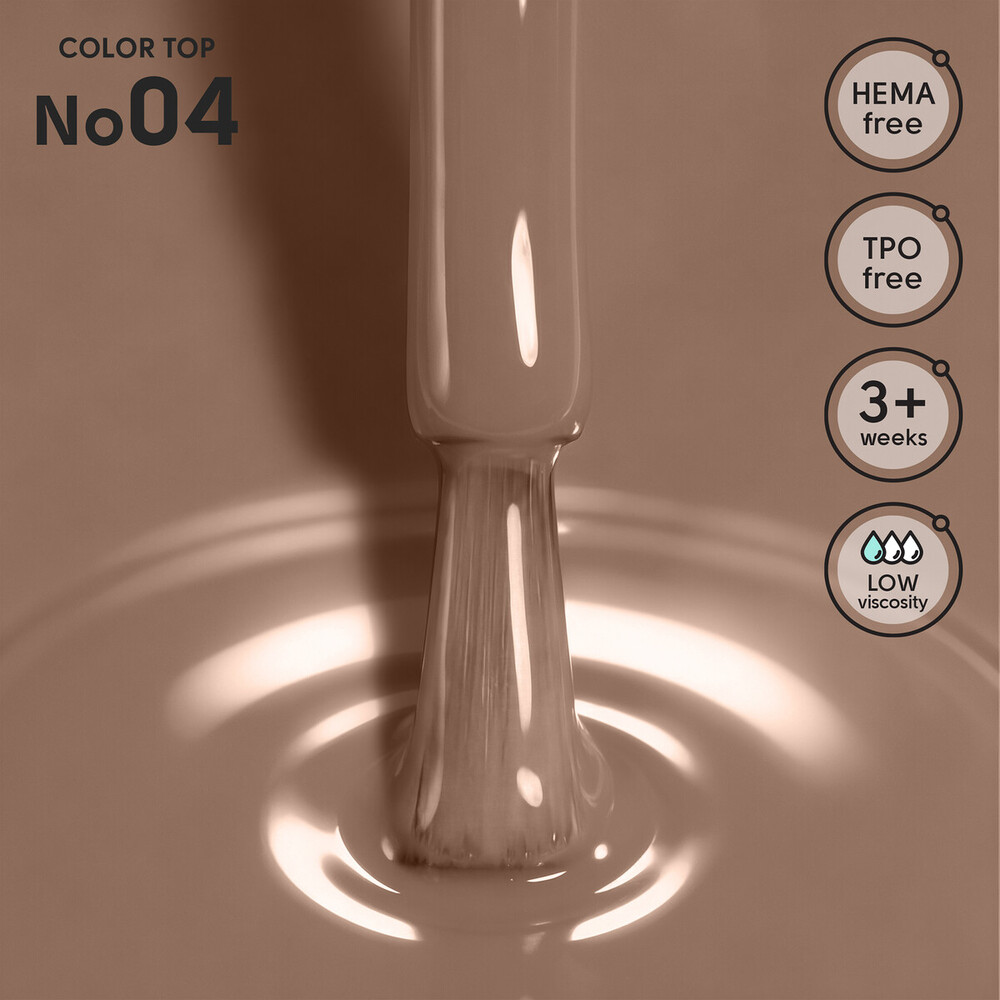 Цветной топ без липкого слоя – финишное покрытие, усиливающее насыщенность оттенка базы или геля и эффективно маскирующее незначительные недостатки покрытия. Позволяет получить более глубокий, равномерный цвет и обеспечивает деликатное камуфлирование без отягощения ногтей. При необходимости может использоваться в качестве самостоятельного покрытия на предварительно укрепленные ногти, создавая аккуратный, завершенный вид без дополнительного перекрытия. Материал обеспечивает стойкость покрытия более 3 недель, сохраняет форму и эстетичный вид. Не содержит HEMA и TPO.