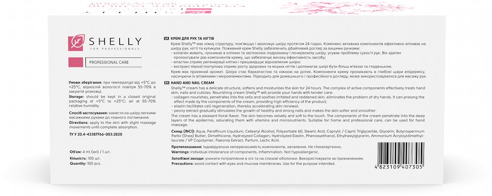 Крем для рук и ногтей с коллагеном, эластином и экстрактом пиона Shelly Professional Care Hand And Nail Cream, 4 мл х 100 шт.