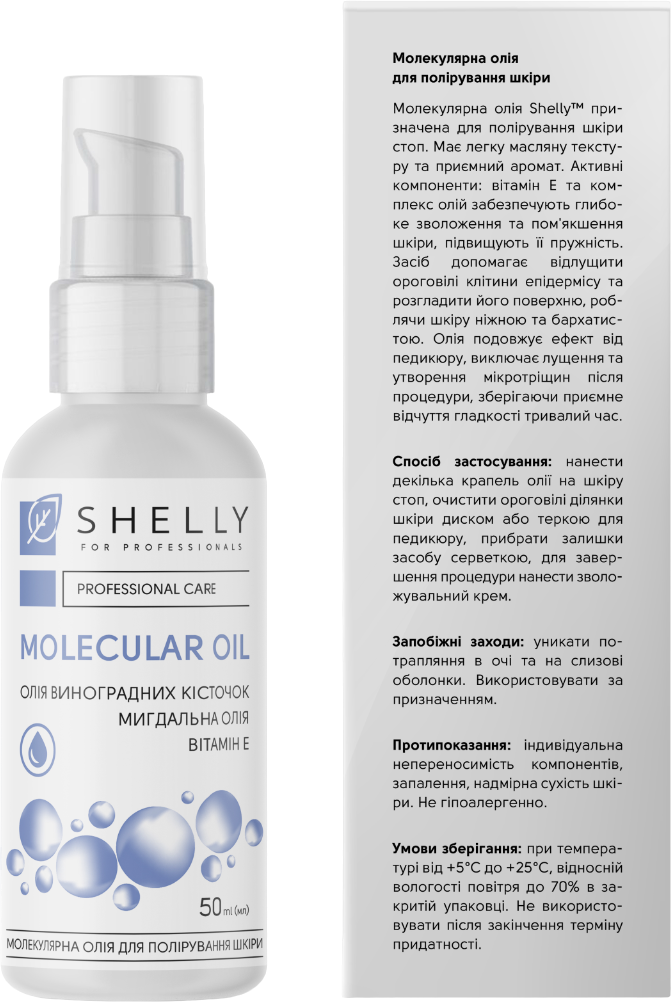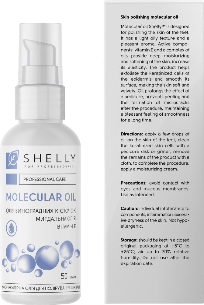 Молекулярное масло Shelly™ предназначено для полировки кожи стоп. Обладает легкой масляной текстурой и приятным ароматом. Активные компоненты: витамин Е и комплекс масел обеспечивают глубокое увлажнение и смягчение кожи, повышают ее упругость. Средство помогает отшелушивать ороговевшие клетки эпидермиса и разгладить его поверхность, делая кожу нежной и бархатистой. Масло удлиняет эффект от педикюра, исключает шелушение и образование микротрещин после процедуры, сохраняя приятное ощущение гладкости длительное время.
