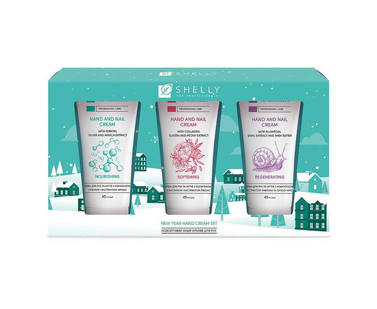 Подарите своей коже увлажнение и нежность с новогодним набором кремов для рук от Shelly ! Набор включает в себя три средства: питательный крем с кератином, серебром и экстрактом арники; смягчающий крем с коллагеном, эластином и экстрактом пиона; восстановительный крем с аллантоином, экстрактом улитки и маслом карите.