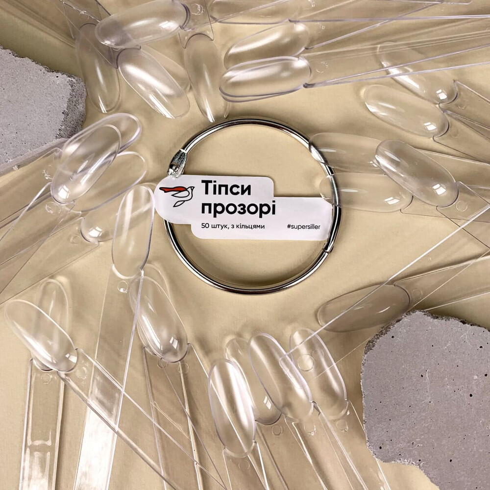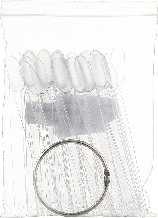 Типсы прозрачной овальной формы идеально подходят для демонстрации образцов декоративных покрытий: лаков, гель-лаков, красок и т.п., отработка всевозможных дизайнов. Они имеют гладкую поверхность, не уродуют оттенки. Для удобного хранения находятся на специальном кольце.