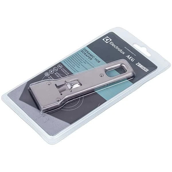 Оригинальный скребок от компании Electrolux для безопасного очищения стеклянных, стеклокерамических, индукционных и галогенных варочных панелей от пригоревших остатков пищи.