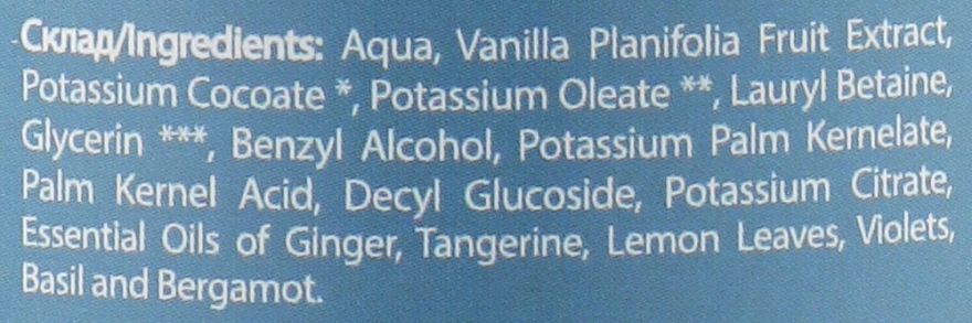 Aqua, Vanilla Planifolia Fruit Extract, Potassium Cocoate*, Potassium Oleate**, Lauryl Betaine, Glycerin ***, Benzyl Alcohol, Potassium Palm Kernelate, Palm Kernel Acid, Decyl Glucoside, Potassium Citrate, Essential Oils Of , Violets, Basil And Bergamot.