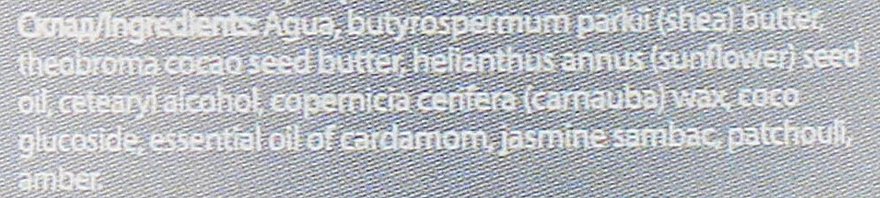 Agua, Butyrospermum Parkii (Shea) Butter, Theobroma Cocao Seed Butter, Helianthus Annus (Sunflower) Seed Oil, Cetearyl Alcohol, Copernicia Cerifera (Carnauba) Wax, Coco Glucoside, Essential Oil Of Cardamom.