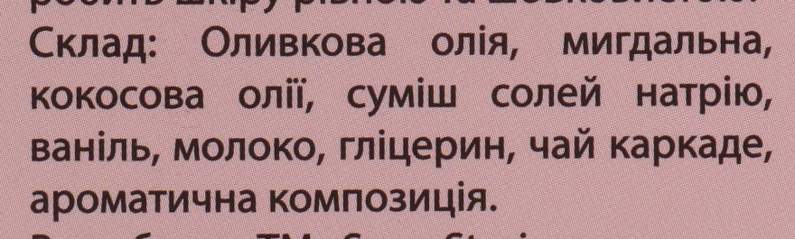 - подходит всем типам кожи, даже чувствительной - содержит комплекс масел и растительных экстрактов: оливковое, кокосовое, миндальное, а также ваниль, молоко и чай каркаде.