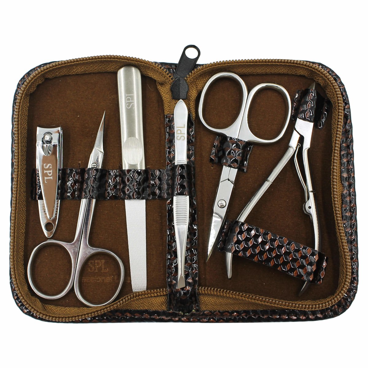 Маникюрный набор SPL – это возможность сэкономить время посещения мастера и качественно провести процедуру обработки ногтей в домашних условиях. В стильном темно-коричневом чехле расположены 6 инструментов, которые будут служить отличной базой личного арсенала. С их помощью можно провести процедуры обрезного и европейского маникюра/педикюра, обеспечивая максимальный комфорт в процессе и желаемый результат по окончании работы. Пилочка – помощник в формировании ногтей, книпсер и ножницы прекрасно справятся с укорочением ногтевых пластин, для работы с кутикулами используйте специальные ножницы и кусачки, а с помощью скошенного пинцета можно привести в порядок брови.