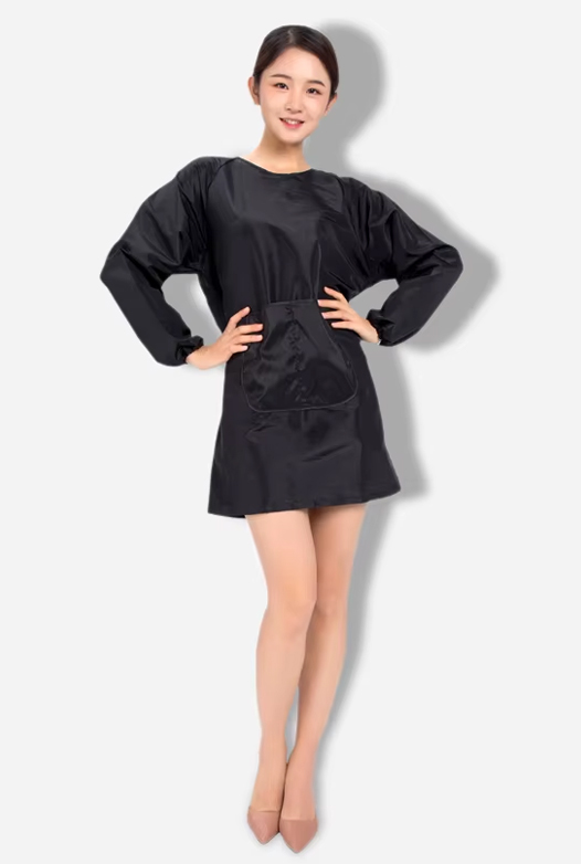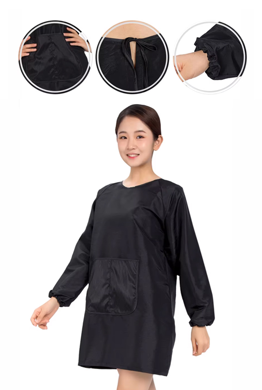 - Рукава для максимальной защиты: Этот пеньюар оборудован рукавами, надежно защищающими одежду клиента от волос и различных обрабатывающих средств во время стрижки, покраски или укладки. Клиент может также смотреть в телефоне во время процедуры, что также придает преимуществам перед обычными пеньюарами.
