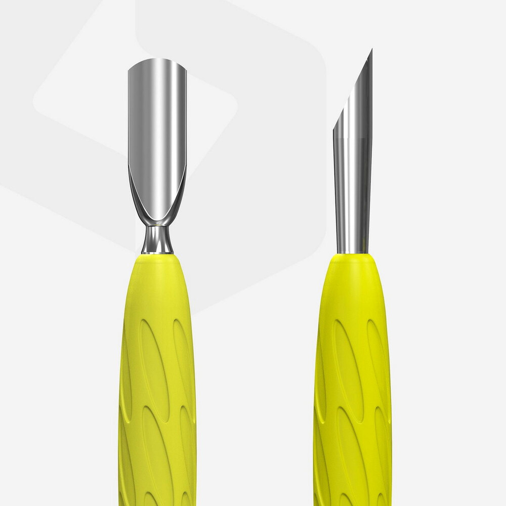 - Рабочая часть "пушер скошенный" используется для поднятия и отдвижения грубой налипшей кутикулы, очистки свободного края ногтя, удаления потоков гель-лака.