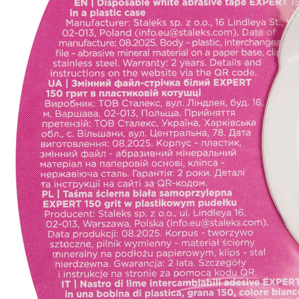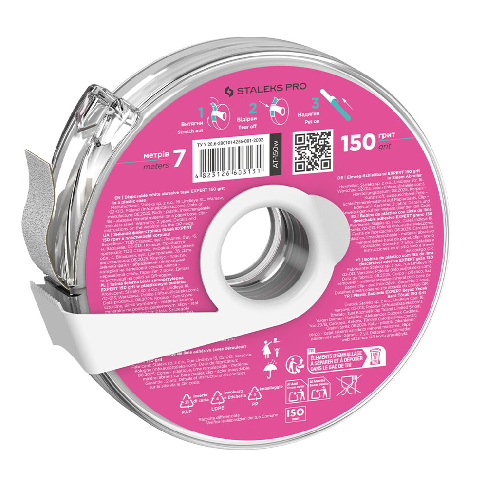 Сменный файл лента Staleks PRO EXPERT 150 грит в пластиковой катушке AT-150w – это профессиональный инструмент при проведении маникюра и педикюра, предназначенный для аккуратной коррекции формы и шлифовки ногтевой пластины. Ее длина 7 метров, с абразивом средней жесткости (150 грит), комфортна в точном опиливании искусственных покрытий и натуральных ногтей, не нагревает поверхность и равномерно снимает материал. Надежное клеевое основание гарантирует прочную фиксацию на металлических или пластиковых пилах-основах (MBE-20, MBE-20s, SPBE-20, SPBE-20s), а специальное покрытие защищает абразив от забивания пылью.