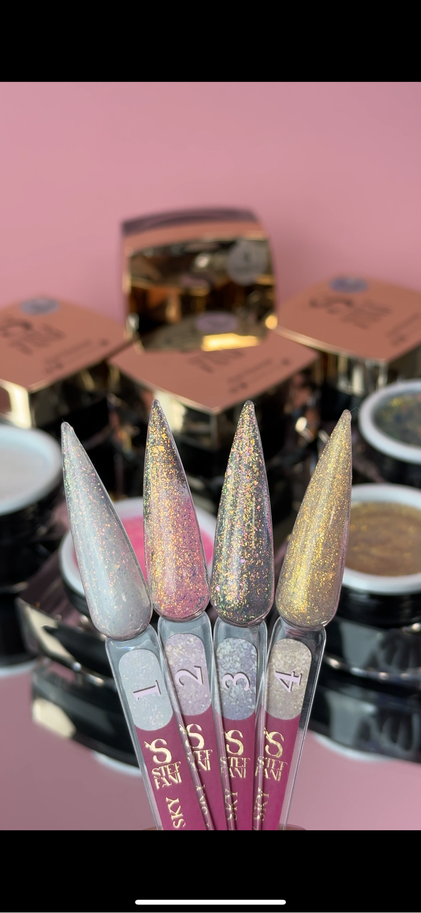 Builder Gel Steffani Starry Sky – это воплощение роскоши и изысканности. Этот гель – умный материал, ведь он легко и равномерно распределяется, удобен в работе и хорошо держит арку ногтя.