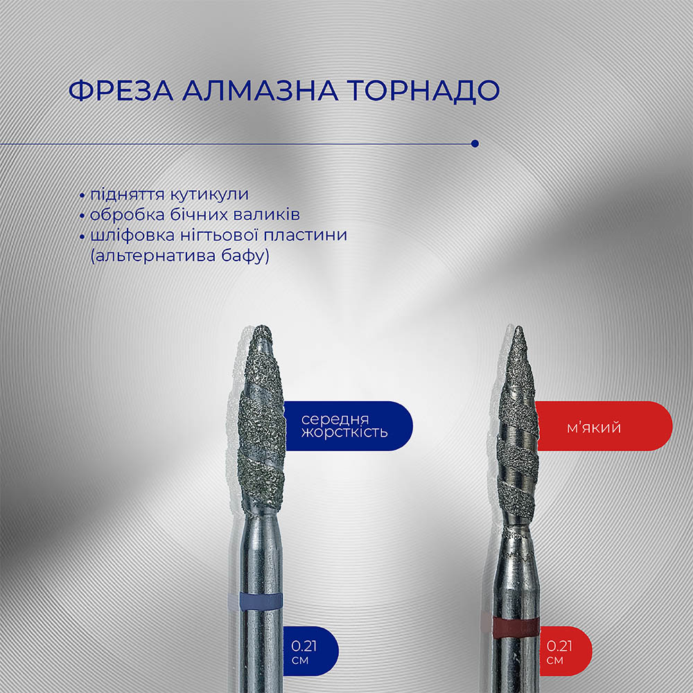 Материал: качественное алмазное покрытие, которое не нагревается и обеспечивает высокую износостойкость от 3 до 8 мес. А расположение зубчиков в спиральном порядке позволяет в разы быстрее обрабатывать кутикулу или валики.