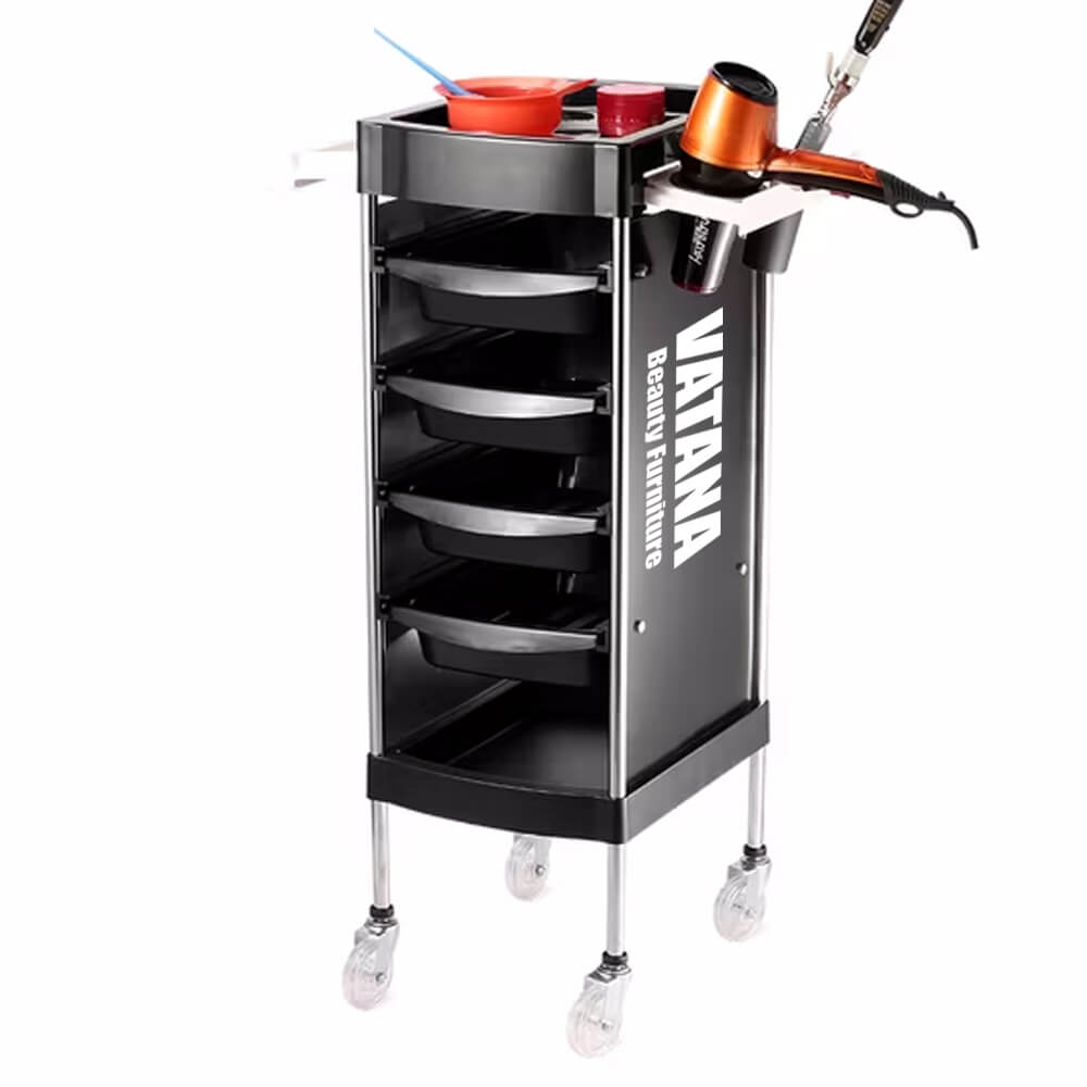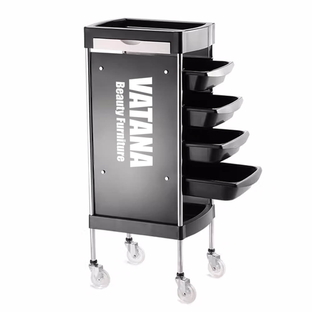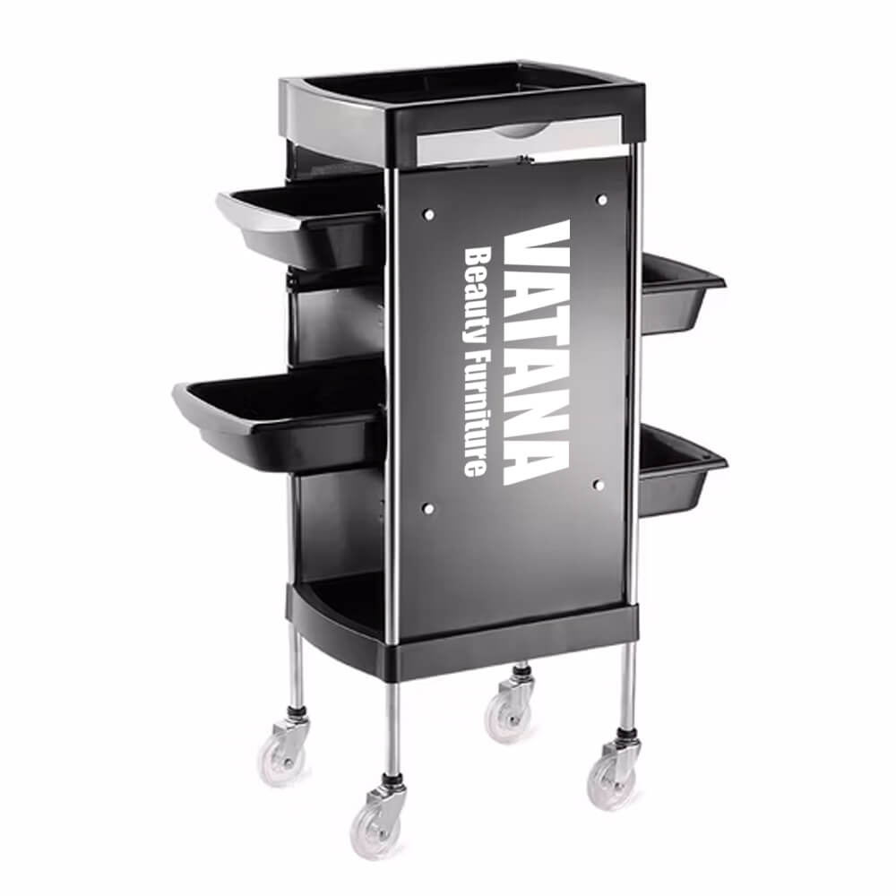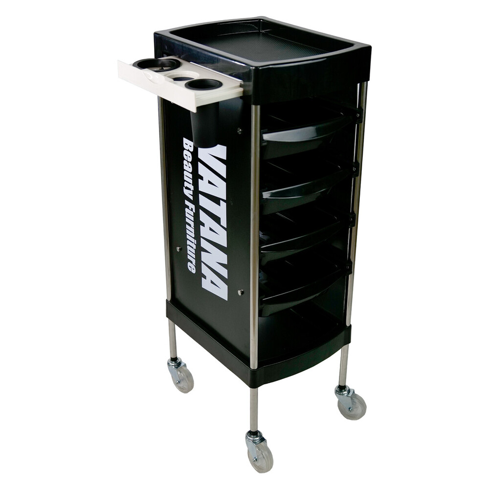 Тележка парикмахерская для салонов красоты на 5 рабочих отделений Vatana 578-005. Максимально универсальный и компактный, подойдет всем мастерам. Его особенность в ровной верхней полке удобна для любых инструментов и двумя выдвижными боковыми полочками которые в случае необходимости полностью незаметно прячутся в корпусе коляски.