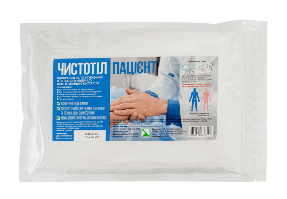 Спосіб використання: 1. Обережно відкрити пакет, одягнути рукавичку на руку та легкими рухами протерти шкіру протягом (3-5 хв.). 2. Для очищення шкіри лежачого пацієнта використовувати не менше 5 рукавичок (обличчя – 1 рукавичка, руки – 1 рукавичка, тулуб та спина – 1 рукавичка, промежина – 1 рукавичка, ноги – 1 рукавичка).